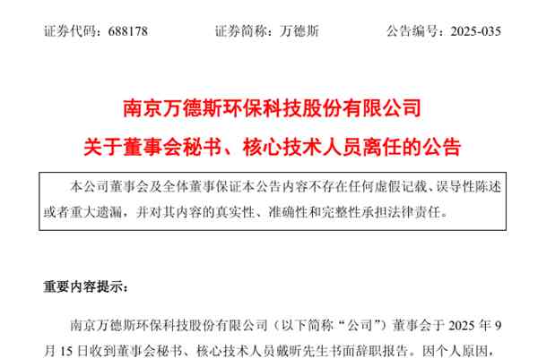 南京万德斯环保科技股份有限公司(简称:万德斯)公告称,公司于2025年9月15日收到董事会秘书、核心技术人员戴昕先生书面辞职报告。因个人原因,戴昕先生辞去公司董事会秘书、核心技术人员职务。辞职后,戴昕先生将不再担任公司任何职务。图源:万德斯公告 据介绍,戴昕先生,男,1983年6月生,中国国籍,无境外永久居留权,硕士研究生学历,正高...