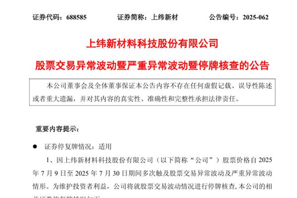 上纬新材料科技股份有限公司(简称:上纬新材)突发公告,表示因公司股票价格自2025年7月9日至2025年7月30日期间多次触及股票交易异常波动及严重异常波动情形。为维护投资者利益,公司将就股票交易波动情况进行停牌核查。图源:上纬新材公告 据悉,2025年7月9日至2025年7月30日期间,上纬新材股票交易7次触及股票交易异常波动情形...