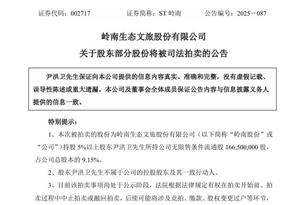 岭南生态文旅股份有限公司(简称:ST 岭南)近日公告称,公司持股5%以上股东尹洪卫先生所持公司无限售条件流通股166,500,000股将被司法拍卖,占公司总股本的9.15%。目前该拍卖事项尚处于公示阶段,法院根据法律规定有权在拍卖开始前、拍卖过程中中止拍卖或撤回拍卖,后续可能将涉及竞拍、缴款、股权变更过户等环节,拍卖结果尚存在不确定性...