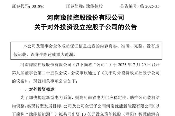 河南豫能控股股份有限公司(简称:豫能控股)近日公告称,为了加快构建新型电力系统,提高河南省电力供应稳定性,助推公司装机结构调整,实现转型发展目标,公司及公司全资子公司河南豫能新能源有限公司拟共同出资10亿元设立豫能控股(濮阳)智慧能源有限责任公司(暂定名,以市场监督局核准登记为准,下称“智慧能源”),出资比例分...