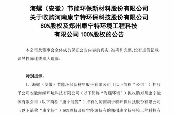 2025年06月18日,海螺(安徽)节能环保新材料股份有限公司发布《关于收购河南康宁特环保科技股份有限公司80%股权及郑州康宁特环境工程科技有限公司 100%股权的公告》。图源:海螺新材公告 海螺新材控股子公司安徽海螺环境科技有限公司拟收购河南康宁特环保科技股份有限公司80%股权及郑州康宁特环境工程科技有限公司 100%股权,合计交...