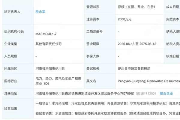 近日,鹏鹞(洛阳)再生资源有限公司成立,注册资本2000万元,经营范围包含:水污染治理;污水处理及其再生利用;再生资源销售;非常规水源利用技术研发;资源再生利用技术研发等。 股权穿透显示,该公司由鹏鹞环保等共同持股。图源:企查查...