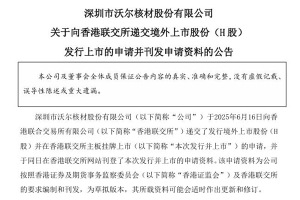 2025年06月17日,深圳市沃尔核材股份有限公司发布《关于向香港联交所递交境外上市股份(H 股)发行上市的申请并刊发申请资料的公告》。图源:沃尔核材公告 沃尔核材于2025年6月16日向香港联合交易所有限公司递交了发行境外上市股份(H 股)并在香港联交所主板挂牌上市的申请。 本次发行的H股股数不超过本次发行后公司总股本的10%(...