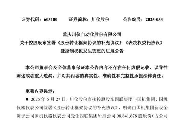 重庆川仪自动化股份有限公司(简称:川仪股份)近日公告称,公司直接控股股东四联集团与国机集团、国机仪器仪表公司签署《股份转让框架协议的补充协议》,明确由国机集团新设全资子公司国机仪器仪表公司受让四联集团所持公司98,841,678股股份(占公司总股本的19.26%);公司间接控股股东渝富控股与国机集团、国机仪器仪表公司签署《表决权委托协...