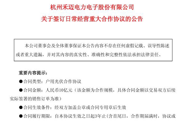 2025年05月27日,杭州禾迈电力电子股份有限公司发布《关于签订日常经营重大合作协议的公告》。图源:禾迈股份公告 近日,禾迈股份及全资子公司杭州禾力新能源有限公司与华融金融租赁股份有限公司签订《合作协议》,协议总金额为10亿元。本合同标的为公司提供的户用光伏系统设备及电站设备的保养和维护服务,若本合同顺利履行,预计将对公司2025...