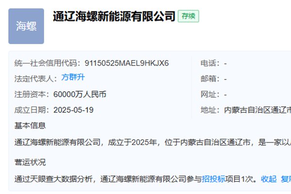 5月19日,通辽海螺新能源有限公司正式成立,注册资本6亿元,经营范围包含: 【许可项目】供电业务;发电业务、输电业务、供(配)电业务;输电、供电、受电电力设施的安装、维修和试验;检验检测服务。(依法须经批准的项目,经相关部门批准后方可开展经营活动,具体经营项目以相关部门批准文件或许可证件为准)【一般项目】储能技术服务;技术服务、技术...