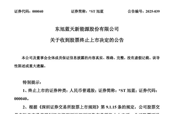 4月29日,东旭蓝天新能源股份有限公司(简称:*ST旭蓝)公告称,公司股票已被深圳证券交易所决定终止上市,并将于4月30日被摘牌。据悉,*ST旭蓝于4月28日收到深圳证券交易所下发的《关于东旭蓝天新能源股份有限公司股票终止上市的决定》(深证上〔2025〕409号)。 公告称2024 年 12 月 31 日至 2025 年 3 月 3...