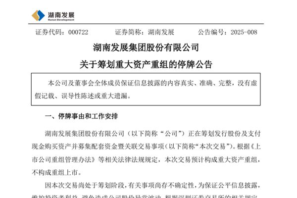 3月18日,湖南发展集团股份有限公司(简称:湖南发展)发布公告称,公司正在筹划发行股份及支付现金购买资产并募集配套资金暨关联交易事项。公司股票自2025年3月19日开市时起开始停牌。 公告显示,湖南发展已与主要交易对方湘投能源签署了《收购框架协议》,拟以发行股份及支付现金方式购买湘投能源持有的铜湾水电90%股权、清水塘水电90%股权...