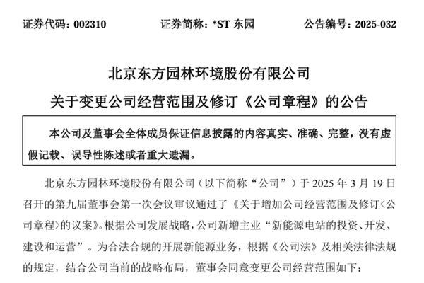 3月19日,北京东方园林环境股份有限公司(简称:*ST东园,下称“东方园林”)发布关于变更公司经营范围及修订《公司章程》的公告。公告显示,东方园林经营范围将新增新能源技术推广服务;新兴能源技术研发;风力发电技术服务;风电场相关系统研发;太阳能发电技术服务;光伏设备及元器件销售;储能技术服务;节能服务管理;合同能...
