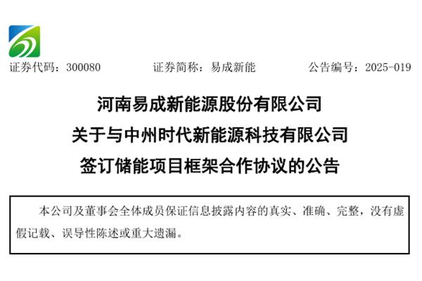 3月12日,A股光伏国企上市公司河南易成新能源股份有限公司(简称:易成新能)发布公告,宣布与宁德时代全资子公司中州时代新能源科技有限公司签署《储能项目框架合作协议》。双方将聚焦河南省内大型工商业用能大户资源,合作开发新能源储能项目、风光发电站资源开发、应用场景拓展及客户服务等,计划到2025年储备储能框架项目规模达500MWh(以实际...