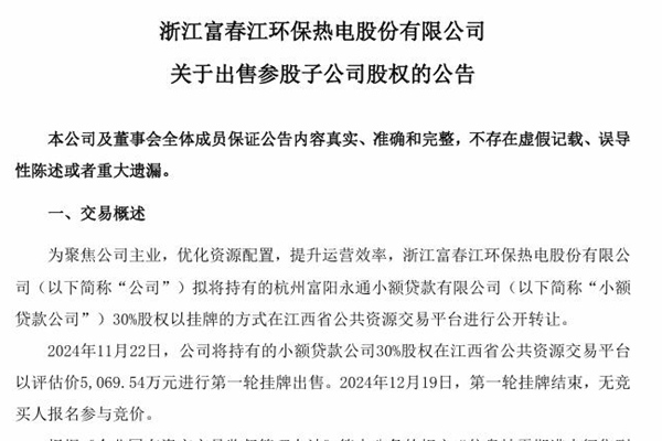 2025年03月14日,浙江富春江环保热电股份有限公司发布《关于出售参股子公司股权的公告》。图源:富春环保公告 富春环保将持有的杭州富阳永通小额贷款有限公司30%股权以挂牌的方式在江西省公共资源交易平台进行公开转让,第一轮评估价5,069.54万元,第二轮评估价4,567.66万元。2025年1月22日,在第二轮挂牌期间浙江富腾仪表...