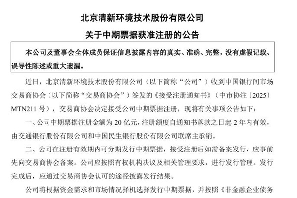 2025年03月14日,北京清新环境技术股份有限公司发布《关于中期票据获准注册的公告》。图源:清新环境公告 北京清新环境技术股份有限公司(以下简称“公司”)收到中国银行间市场交易商协会签发的《接受注册通知书》(中市协注〔2025〕MTN211 号),交易商协会决定接受公司中期票据注册。 清新环境中期票据注...