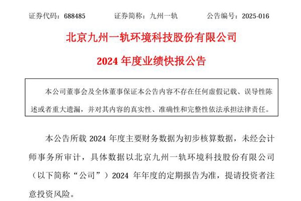 北京九州一轨环境科技股份有限公司(简称:九州一轨)近日发布《2024 年度业绩快报公告》。快报显示,九州一轨2024年实现营业总收入3.75亿元,同比上涨36.35%;归属于母公司股东的净利润1082.03万元,同比上涨747.19%;基本每股收益为0.09元;归属于母公司股东的每股净资产为8.47元。 九州一轨的主营业...