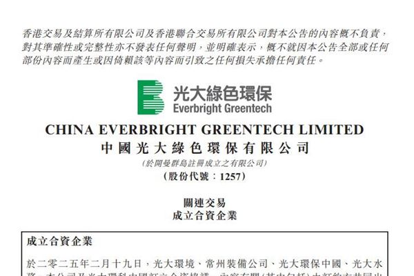 中国光大绿色环保公布,于2025年2月19日,光大环境、常州装备公司、光大环保中国、光大水务、本公司及光大环科中国订立合资协议,内容有关(其中包括)由订约方共同出资成立合资企业。 根据合资协议,合资企业的注册资本为人民币5000万元,其中该公司将以现金出资人民币500万元,占合资企业注册资本的10%;光大环境将以现金出资人民币150...
