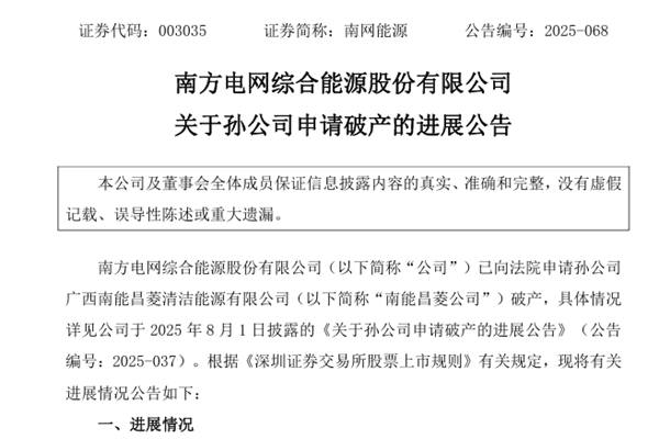 南方电网综合能源股份有限公司(简称:南网能源)公告称,近日,公司收到广西壮族自治区高级人民法院(下称“广西高院”)出具的《民事裁定书》[(2025)桂破终12号],广西高院维持不予受理公司对广西南能昌菱清洁能源有限公司(下称“南能昌菱公司”)的破产清算申请的裁定。本次裁定为终审裁定。 ...