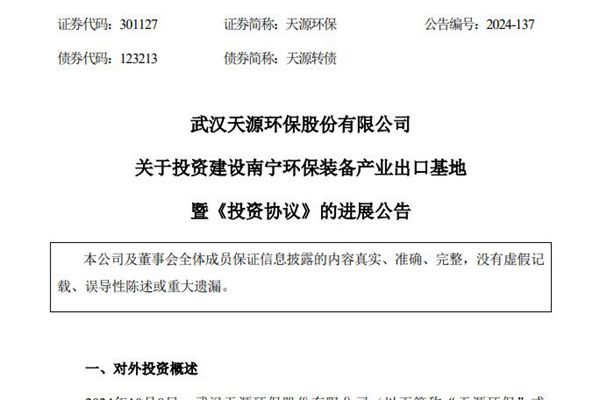 武汉天源环保股份有限公司(简称:天源环保)11月20日盘后公告称,公司召开了第六届董事会第九次会议和第六届监事会第六次会议,分别审议通过了《关于投资建设南宁环保装备产业出口基地的议案》。投资协议书中提到,天源环保将在南宁高新区设立的持股100%且独立核算的公司作为项目实施主体,投资规模约85,725.83万元,其中固定资产投资约67,...