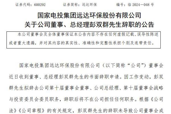国家电投集团远达环保股份有限公司(简称:远达环保)11月16日发布《关于公司董事、总经理彭双群先生辞职的公告》。公告显示,远达环保董事会近日收到了董事、总经理彭双群先生的书面辞职申请,因工作变动,彭双群先生拟辞去公司第十届董事会董事、公司总经理、第十届董事会战略与投资委员会委员职务,辞职后将不在公司担任任何职务。 据公开资料,远达环...