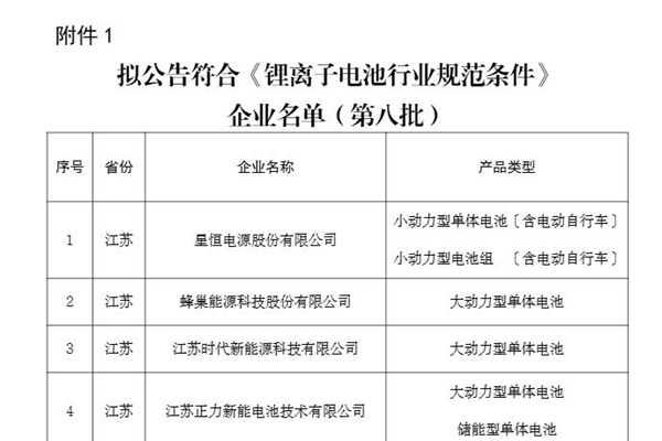 拟公告符合《锂离子电池行业规范条件》企业名单(第八批)公示 根据《锂离子电池行业规范条件(2024年本)》《锂离子电池行业规范公告管理办法(2024年本)》,经企业自愿申报、省级主管部门推荐、专家评审、现场核查等程序,现将拟公告符合《锂离子电池行业规范条件》企业名单(第八批)予以公示(见附件1)。已公告企业杭州南都动力科技有限公司、浙江...