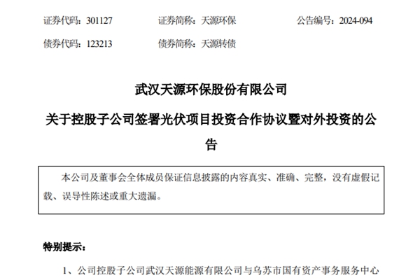 近日,武汉天源环保股份有限公司(以下简称“公司”)控股子公司武汉天源能源有限公司与乌苏市国有资产事务服务中心本着友好合作、互惠互利的原则,在平等自愿的基础上,拟就投资建设“第七师胡杨河市兵地融合2GW光伏(新疆兴起航新能源有限公司1GW)项目”(以下简称“项目”)...