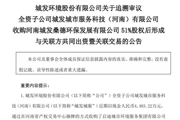 5月10日,城发环境公告,为进一步扩大省内环卫产业市场份额,同时减少同业竞争,公司全资子公司城发城服近期以现金人民币4483.22万元,通过在河南省产权交易中心摘牌的方式收购了启迪城市环境服务集团有限公司持有的河南城发桑德环保发展有限公司51%股权。 河南城发桑德环保发展有限公司经营范围:城市环境卫生管理;市政公共设施管理;清洁服务...