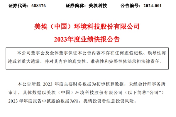 近日,美埃(中国)环境科技股份有限公司(下称“美埃科技”)发布《2023年度业绩快报公告》。 报告期内,公司实现营业收入 150,361.74 万元,同比增长 22.54%;实现归属于母公司所有者的净利润 17,319.68 万元,同比增长 40.73%;实现归属于母公司所有者的扣除非经常性损益的净利润 15...