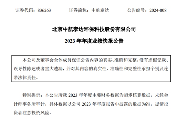 2024年2月27日,北京中航泰达环保科技股份有限公司发布《2023年年度业绩快报公告》。特别提示:本公告所载2023年年度主要财务数据为初步核算数据,未经会计师事务所审计,具体数据以公司2023年年度报告中披露的数据为准。 公告显示,中航泰达2023年年度预计营收4.6亿,变动比例+11.67%;归属于上市公司股东的净利润7804...