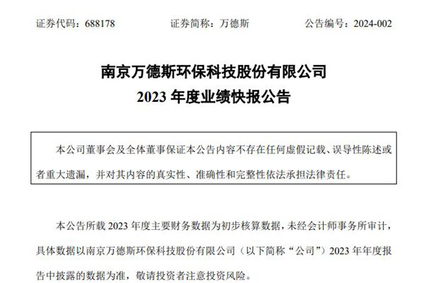 南京万德斯环保科技股份有限公司(简称:万德斯)近日发布《2023 年度业绩快报》,共实现营业总收入84,241.19万元,同比下滑2.03%;归属于母公司所有者的净利润亏损8,303.45万元,同比下滑471.37%;基本每股收益-0.98元,同比下降475.73%。 万德斯认为,影响公司业绩的因素主要有四个:1)受宏观经济环境及行...