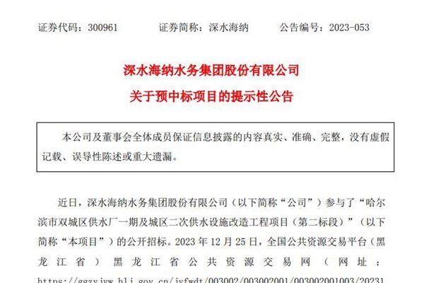 12月26日,深水海纳水务集团股份有限公司(简称:深水海纳)发布公告称,公司已成为“哈尔滨市双城区供水厂一期及城区二次供水设施改造工程项目(第二标段)”预中标人,投标报价为人民币34,125,460.68元。 项目建设内容包括市区配水管网上增设11处 DN200、DN300管线排泥井泄水点、增设1处DN400...
