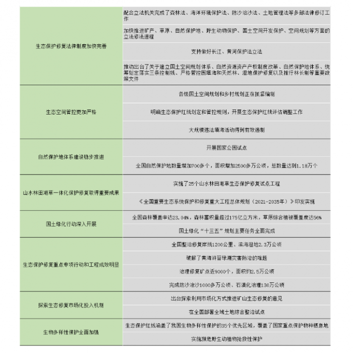 导读:“十三五”期间,中央财政累计安排生态保护修复相关转移支付资金8779亿元。另外,国家绿色发展基金首期募集资金885亿元,其中中央财政出资100亿元。“十四五”期间,力争到2025年全国森林覆盖率达到24.1%,森林蓄积量达到190亿立方米,草原综合植被盖度达到57%,湿地保护率达到55%,60%可治理沙化土地得到治理。 &e...