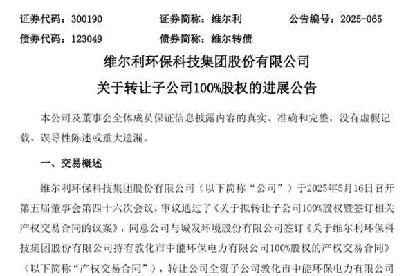 维尔利环保科技集团股份有限公司(简称:维尔利)公告称,近日,公司已完成全资子公司敦化市中能环保电力有限公司(下称“敦化中能”)的工商变更登记手续,根据敦化市市场监督管理局出具的《企业变更情况》,敦化中能的股东由维尔利环保科技集团股份有限公司变更为城发环境股份有限公司。变更登记完成后,公司不再持有敦化中能股权,敦...