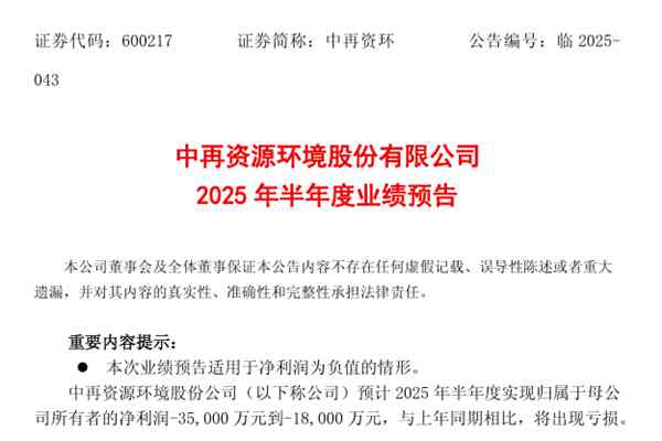 中再资源环境股份有限公司(简称:中再资环)近日发布《2025年半年度业绩预告》。报告期内,中再资环预计实现归属于母公司所有者的净利润-35,000万元到-18,000万元,与上年同期相比,将出现亏损;预计2025年半年度实现归属于母公司所有者的扣除非经常性损益后的净利润-36,000万元到-19,000万元。 中再资环表示,本期业绩...
