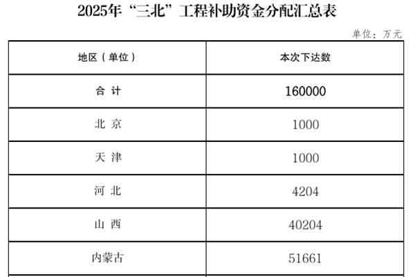 近日,财政部下达2025年“三北”工程补助资金预算,共计16亿元。 详情如下↓ 财政部关于下达2025年“三北”工程补助资金预算的通知 财资环〔2025〕55号 有关省、自治区、直辖市财政厅(局),新疆生产建设兵团财政局: 为提高预算编制完整性,加快预算执行进度,现就...