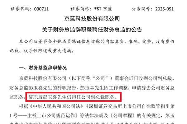 京蓝科技股份有限公司(简称:*ST京蓝)公告称,公司董事会近日收到公司副总裁、财务总监彭玉喜先生的辞职报告,彭玉喜先生因工作调整,申请辞去公司财务总监职务,辞职后彭玉喜先生仍担任公司副总裁职务。 6月18日,*ST京蓝召开了第十一届董事会第十六次临时会议,审议通过《关于聘任财务总监的议案》,同意聘任宋建伟先生为公司财务总监,任期自本...