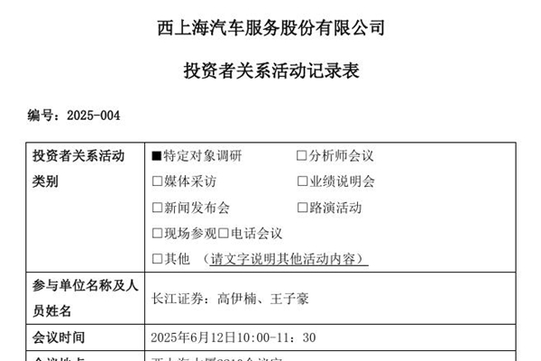 2025年06月13日,西上海汽车服务股份有限公司发布《投资者关系活动记录表》。图源:西上海公告 1. 问:请介绍一下公司2024年度的经营情况。 答:2024年,面对百年变局下的宏观环境分化、产业周期转换和行业格局重塑,公司管理层在股东的大力支持和董事会的正确领导下,始终秉承“一切从诚信开始”的核心理念,...