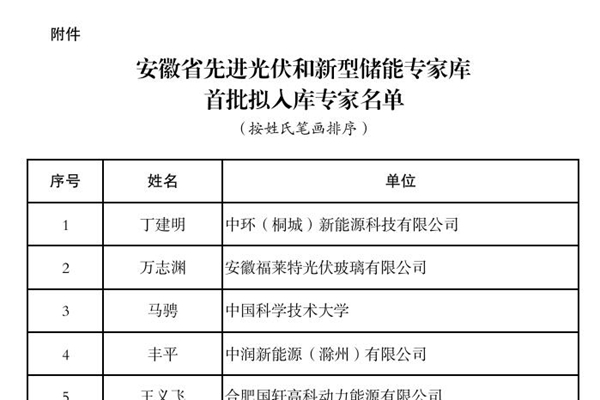 关于安徽省先进光伏和新型储能专家库首批拟入库专家名单的公示 为深入贯彻落实《关于强化创新引领推动先进光伏和新型储能产业集群高质量发展的指导意见》,充分发挥专业人员在促进光储产业高质量发展中智力支撑作用,根据《安徽省先进光伏和新型储能产业集群建设领导小组办公室关于征集先进光伏和新型储能领域专家库的通知》,经公开征集、择优入库,拟将丁建明等...