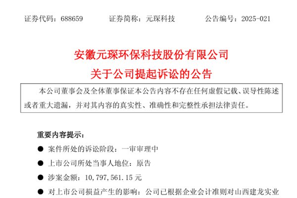 近日,安徽元琛环保科技股份有限公司(简称:元琛科技)就与山西建龙实业有限公司的合同纠纷向山西省闻喜县人民法院提起诉讼,[案号(2025)晋0823民初1206号],本案已于近日获法院审理,该案目前处于法院一审审理阶段。 元琛科技作为原告,诉讼请求为: 1. 请求判令解除原、被告双方于2022年9月签订的《山西建龙实业有限公司炼铁总...