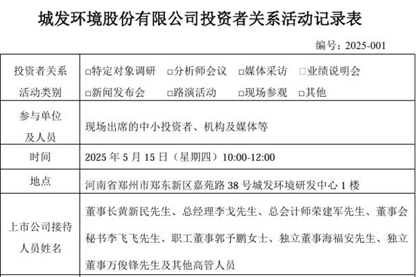 2025年05月16日, 城发环境股份有限公司发布《2025年5月15日投资者关系活动记录表》。图源:城发环境公告 (一)总体情况介绍 2024年是城发环境战略转型的关键一年。公司秉持“让环境·生活更美好”的企业使命,坚守“绿色循环,生生不息,成为无废城市的建设者、低碳生活的引领者...