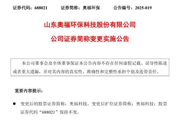 山东奥福环保科技股份有限公司(简称“奥福环保”)公告称,自2025年5月19日起,公司股票证券简称将由“奥福环保”变更为“奥福科技”,公司全称和证券代码保持不变。 据悉,奥福环保是一家以蜂窝陶瓷载体研发制作销售为一体的科创板上市企业,始终以材料技术为核心竞争力实...