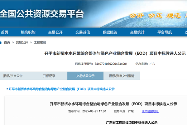 近日,广东省开平市新桥水水环境综合整治与绿色产业融合发展(EOD)项目中标候选人公示,项目工程总投资估算为148779.79万元。 第一中标候选人为(主)邢台路桥建设集团有限公司、(成)河北航东建设工程股份有限公司、河北勘邸建设工程有限公司、广东省建筑设计研究院集团股份有限公司、领睿建设工程有限公司、广东省岩土勘测设计研究有限公司、...