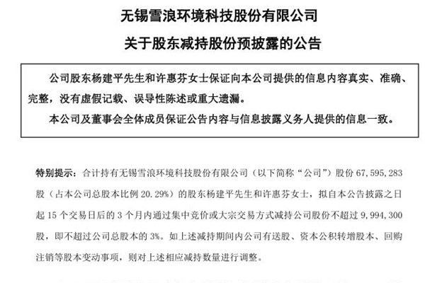 2025年03月03日,无锡雪浪环境科技股份有限公司发布《关于股东减持股份预披露的公告》。图源:雪浪环境公告 公告表示,雪浪环境股东杨建平先生和许惠芬女士将在3个月内通过集中竞价或大宗交易方式减持公司股份不超过9,994,300股,即不超过公司总股本的3%。 减持原因:家庭资产规划 减持价格区间:根据市场价格确定 杨建平先生...