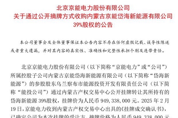 2025年02月21日,北京京能电力股份有限公司发布《关于通过公开摘牌方式收购内蒙古京能岱海新能源有限公司39%股权的公告》。图源:京能电力公告 公告显示,京能电力收到内蒙古产权交易中心出具的《挂牌成交确认书》,确定公司为内蒙古京能岱海新能源有限公司39%股权的受让方,摘牌价格为人民币949,338,000元。本次摘牌收购岱海新能源...