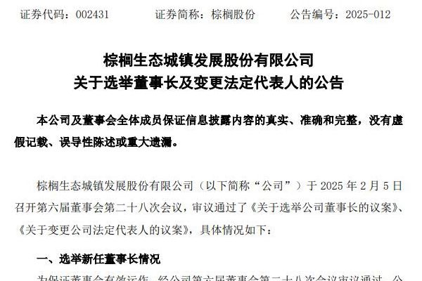 2月5日,棕榈生态城镇发展股份有限公司 (简称:棕榈股份)发布《关于选举董事长及变更法定代表人的公告》,公司董事会选举“刘江华”先生担任公司第六届董事会董事长,任期自董事会审议通过之日起至本届董事会任期届满之日止。 棕榈股份原法定代表人汪耿超先生已辞任公司董事长、发展战略委员会委员、提名与薪酬考核委员会委员、...