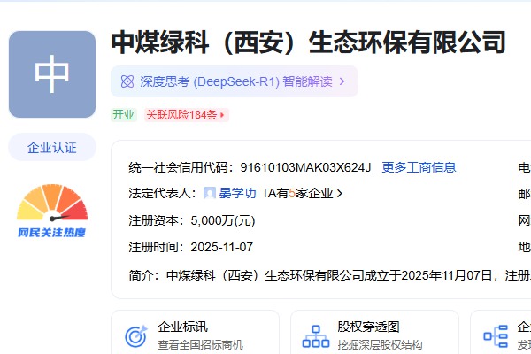 近日,中煤绿科(西安)生态环保有限公司成立,法定代表人为晏学功,注册资本5000万元人民币,经营范围包括: 【一般项目】水污染治理;污水处理及其再生利用;碳减排、碳转化、碳捕捉、碳封存技术研发;水环境污染防治服务;固体废物治理;大气污染治理;煤炭洗选;技术服务、技术开发、技术咨询、技术交流、技术转让、技术推广;非常规水源利用技术研发...