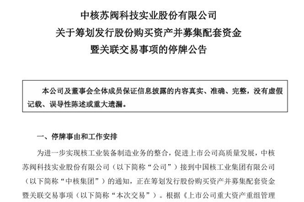2024年12月30日,中核苏阀科技实业股份有限公司发布《关于筹划发行股份购买资产并募集配套资金暨关联交易事项的停牌公告》。图源:中核科技公告 公告显示,中核科技接到中核集团的通知,正在筹划发行股份购买资产并募集配套资金暨关联交易事项,本次交易预计构成重大资产重组,亦构成公司关联交易,本次重组不会导致公司实际控制人变更。 公告显示...