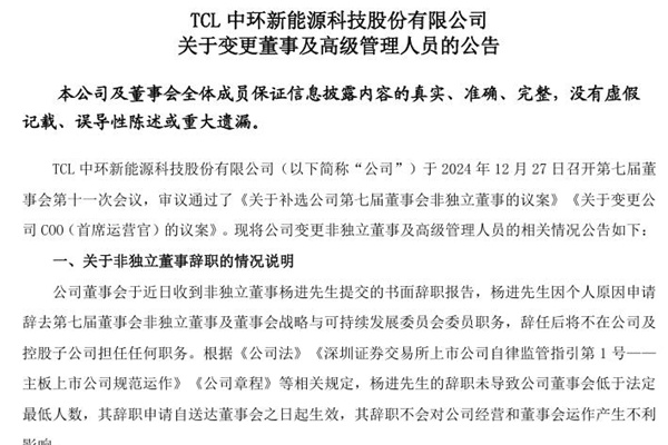 2024年12月28日,TCL 中环新能源科技股份有限公司发布《关于变更董事及高级管理人员的公告》。图源:TCL 中环公告 公告显示,公司董事会于近日收到非独立董事杨进先生提交的书面辞职报告,杨进先生因个人原因申请辞去第七届董事会非独立董事及董事会战略与可持续发展委员会委员职务,辞任后将不在公司及控股子公司担任任何职务。 公告表示...