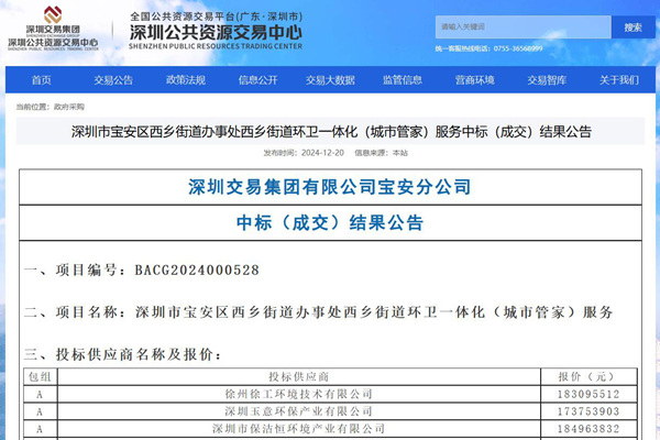 2024年12月21日,深圳公共资源交易中心公开了《深圳市宝安区西乡街道办事处西乡街道环卫一体化(城市管家)服务中标(成交)结果公告》。 按照公告显示,该项目中标(成交)金额183086827.87元,此前招标公告显示预算金额是186832154.17元。 本次招标共有13家企业/联合体参与,包括徐工环境、福龙马、北控、玉禾田、中...