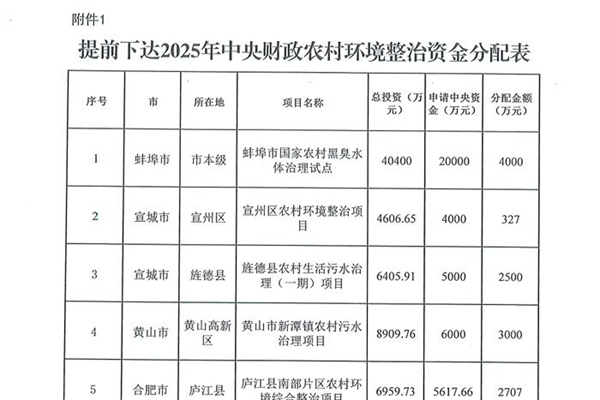 安徽省财政厅 安徽省生态环境厅关于提前下达2025年中央财政农村环境整治资金的通知 有关市、县(区)财政局、生态环境局: 根据《财政部关于提前下达2025 年度农村环境整治资金预算的通知》(财资环[2024]129号),为加快推进农村环境整治工作,促进农村生态环境质量持续改善,现提前下达你市、县(区)2025年中央财政农村环境整治资金...