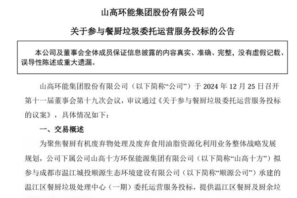 2024年12月26日,山高环能集团股份有限公司发布《关于参与餐厨垃圾委托运营服务投标的公告》。图源:山高环能公告 公告显示,山高环能下属公司山高十方环保能源集团有限公司拟参与成都市温江城投顺源生态环境建设有限公司承建的温江区餐厨垃圾处理中心(一期)委托运营服务投标,提供温江区餐厨及厨余垃圾的收运、处置服务。 公告称,本次参与投标...
