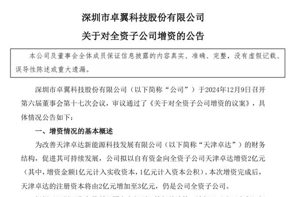2024年12月10日,深圳市卓翼科技股份有限公司发布《关于对全资子公司增资的公告》。图源:卓翼科技公告 公告显示, 为改善天津卓达新能源科技发展有限公司的财务结构,促进其可持续发展,拟以自有资金向全资子公司天津卓达增资2亿元(其中,增资金额1亿元计入实收资本,1亿元计入资本公积)。本次增资完成后,天津卓达的注册资本将由2亿元增加至...