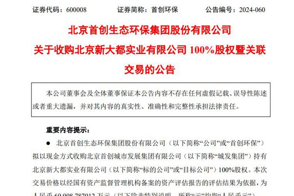 11月28日,北京首创生态环保集团股份有限公司(简称:首创环保)发布公告,表示将以现金方式收购北京首创城市发展集团有限公司(以下简称“首创城发集团”)持有北京新大都实业有限公司(以下简称“新大都实业”)100%股权。以经国有资产监督管理机构备案的资产评估报告的评估结果为依据,本次交易价格...